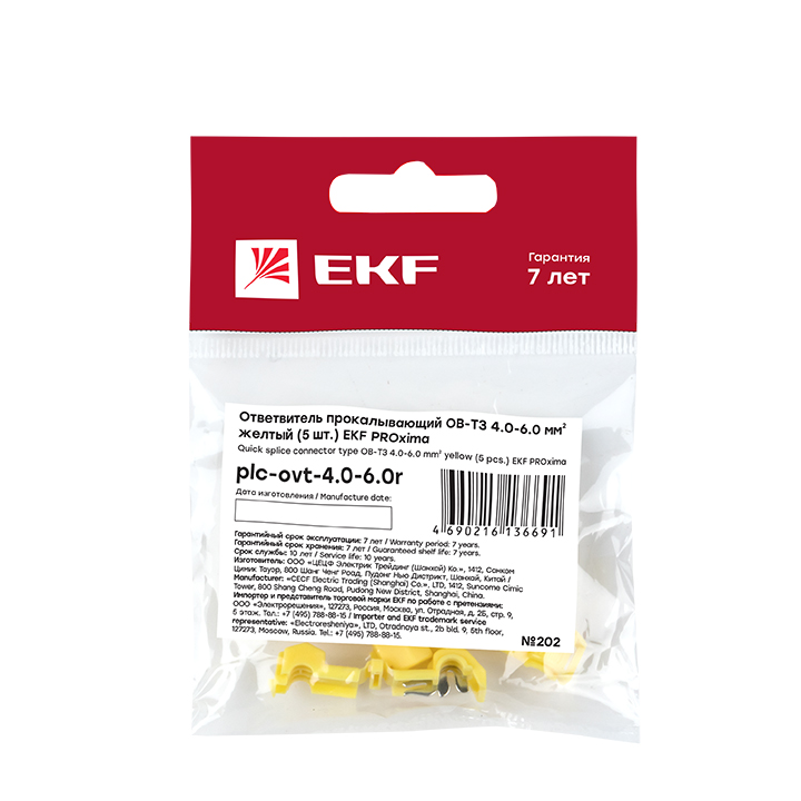 - EKF Ответвитель прокалывающий ОВ-Т 3 4.0-6.0мм2 желтый (5 шт) PROxima (plc-ovt-4.0-6.0r)