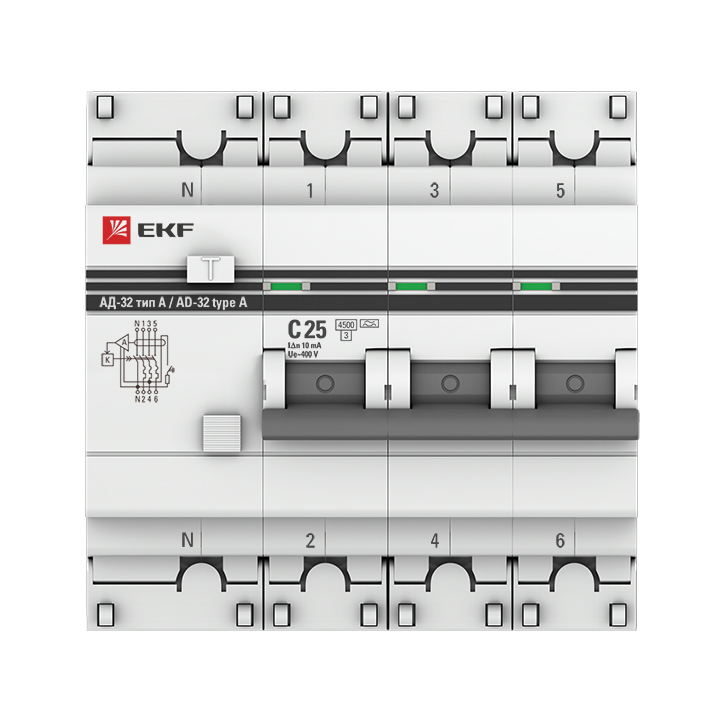 - EKF Автомат дифференциальный АД-32 3P+N 25А/10мА (тип А) PROxima (DA32-25-10-4P-a-pro)