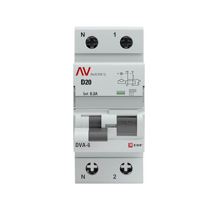- EKF Автомат дифференциальный DVA-6 1P+N 20А (D) 300мА (AC) 6кА AVERES (rcbo6-1pn-20D-300-ac-av)