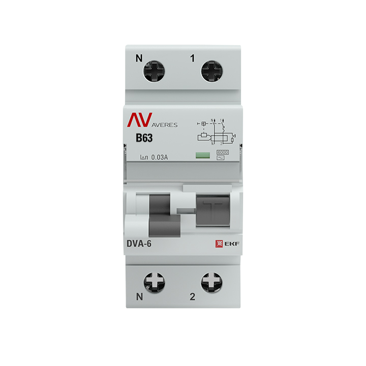 - EKF Автомат дифференциальный DVA-6 1P+N 63А (B) 30мА (AC) 6кА AVERES (rcbo6-1pn-63B-30-ac-av)