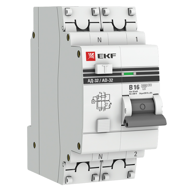 - EKF Дифференциальный автомат АД-32 1P+N 16А/10мА (хар. B, AC, электронный, защита 270В) 4,5кА PROxi (DA32-16-B-10-pro)