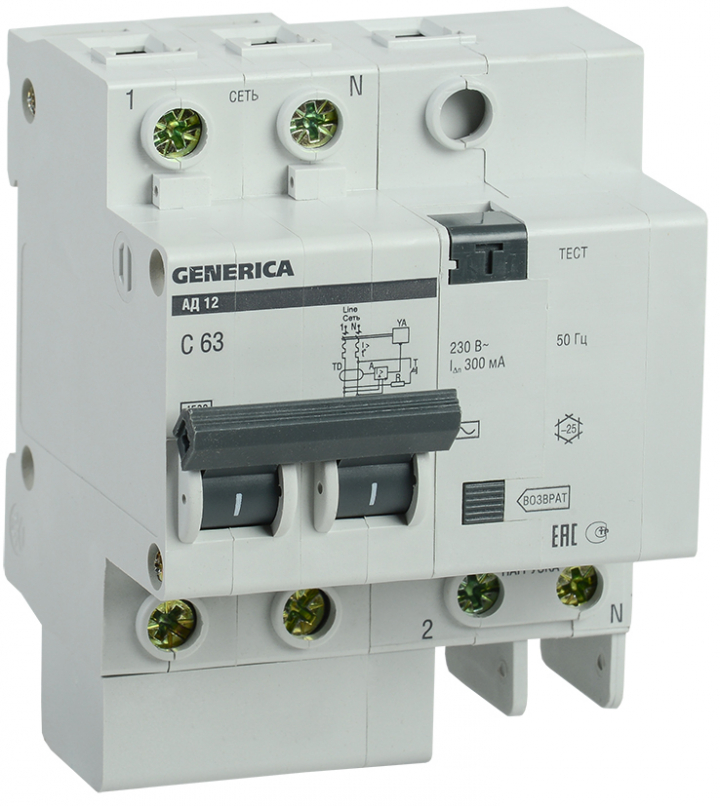 - IEK Выключатель автоматический дифференциальный АД12 2Р 63А 300мА GENERICA (MAD15-2-063-C-300)