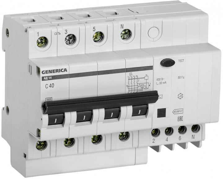 - IEK Выключатель автоматический дифференциальный АД14 4Р 40А 30мА GENERICA (MAD15-4-040-C-030)