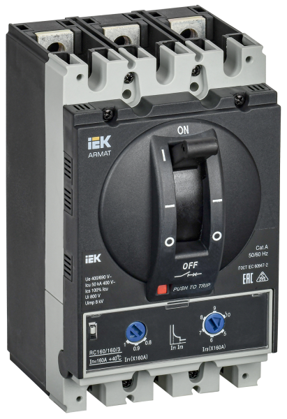 - IEK ARMAT Автоматический выключатель в литом корпусе 3P типоразмер D 50кА 160А расцепитель термомагнитный регулируемый (AR-MCCB-3D-050-0160A-ATUC)