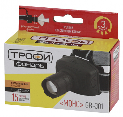 - ЭРА Фонарь светодиодный GB-301 Трофи налобный [3Вт, 3хААА, карт] (20/120/1800) (Б0030187)