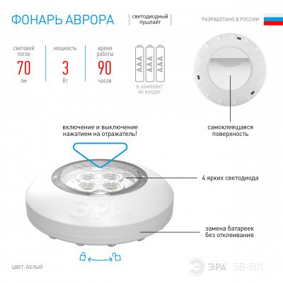 - ЭРА SB-501 Фонарь пушлайт Аврора [4xLED, 3xAAA, белый, 1шт в кор] (60/240/1920) (Б0029181)