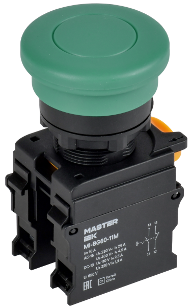 - IEK Кнопка ''Грибок'' с фиксацией d=22мм 1NO+1NC зелёная MASTER ' (MI-BG60-11M-3-21-K06)