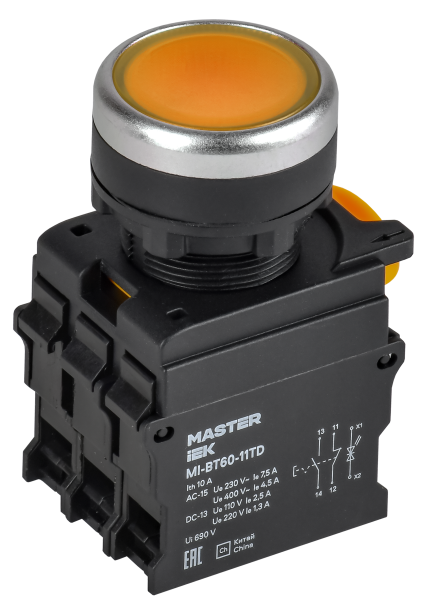 - IEK Кнопка с подсветкой и фиксацией d=22мм 1NO+1NC жёлтая MASTER (MI-BT60-11TD-3-11-K05)