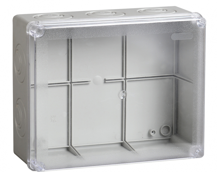 - IEK Коробка КМ41275 распаячная для открытой проводки 240х195х90мм IP44 (RAL7035 прозрачный красный кабельные вводы 5 шт) (UKO10-240-195-090-K51-44)