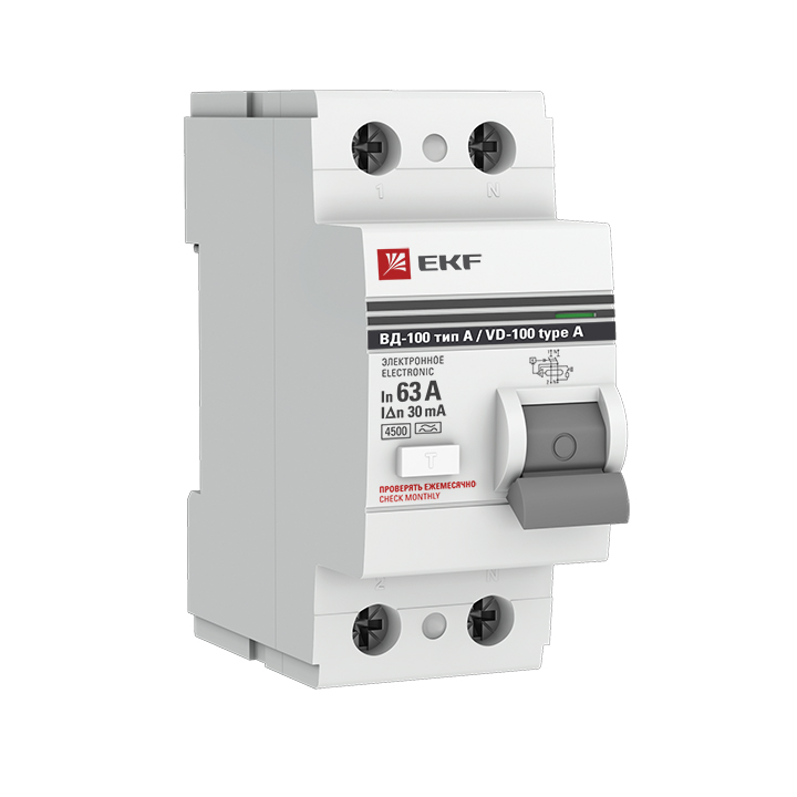 - EKF Устройство защитного отключения ВД-100 2P 63А/30мА электронный тип A PROxima (elcb-2-63-30-e-a-pro)