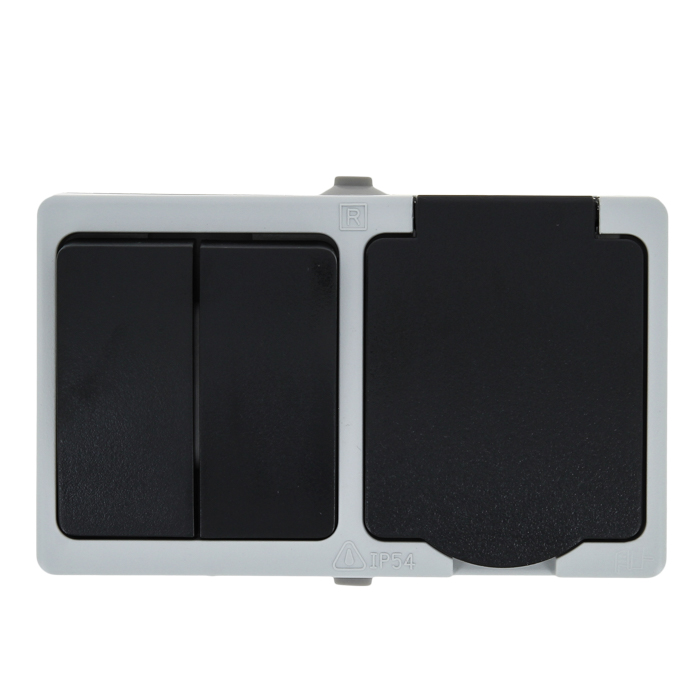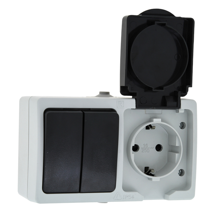 - EKF Венеция Блок Розетка-выключатель двухклавишный 16А с заземлением с крышкой IP54 серый с защитными ш (EVRV16-052-30-540)