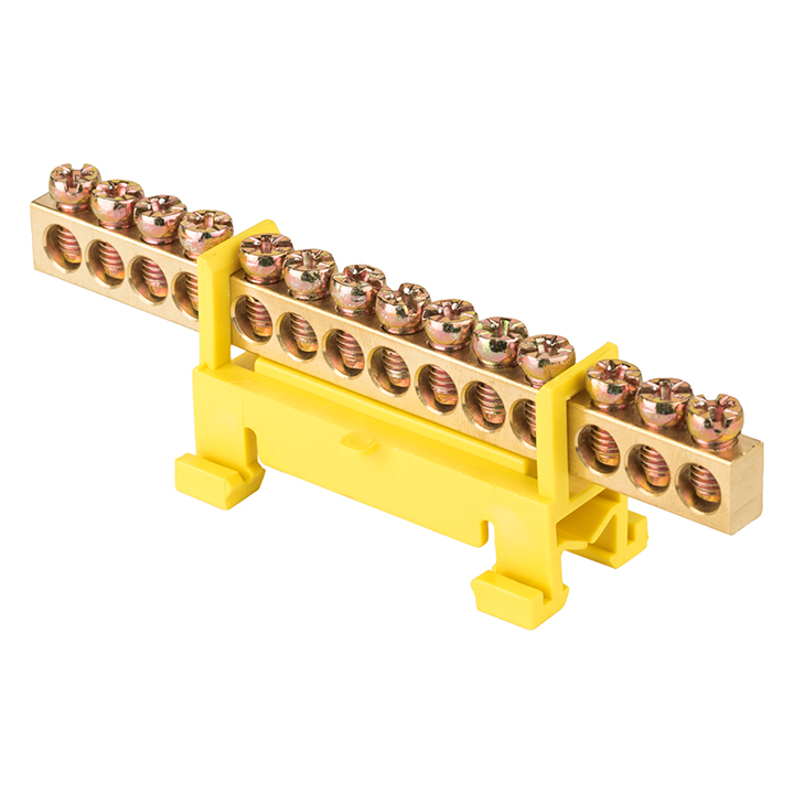 - EKF Шина 0 PE (6х9мм) 14 отверстий латунь желтый изолятор тип Стойка на DIN-рейку PROxima (sn0-63-14-sy)