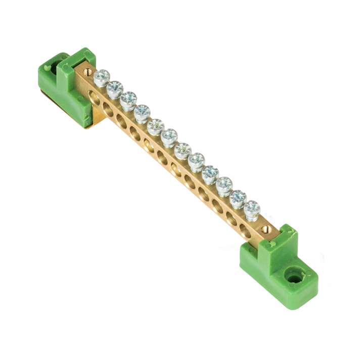 - EKF Шина 0 PE 6x9мм 12 отверстий латунь с контактной пластиной 2 зелёных угловых изолятора PROxima (sn0-63-12-2-pe)