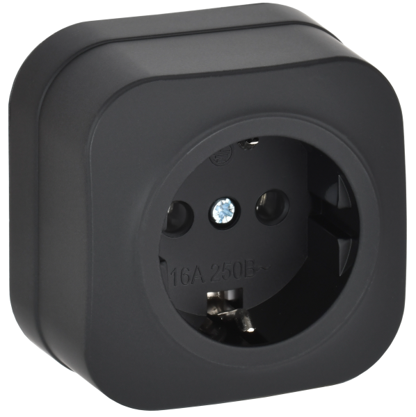 - IEK GLORY Розетка 1-местная для открытой установки с заземлением без защитных шторок 16А РС20-3-ХЧм черный матовый (ERH11-K02M-16)