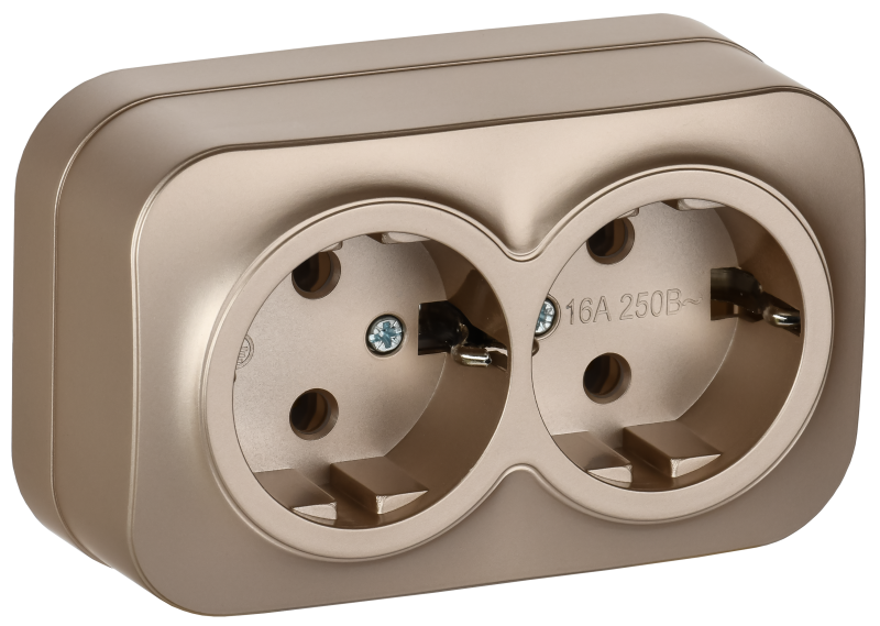 - IEK GLORY Розетка 2-местная для открытой установки с заземлением без защитных шторок 16А РС22-3-ХШм шампань матовый (ERH21-K37M-16)