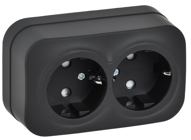 - IEK GLORY Розетка 2-местная для открытой установки с заземлением с защитными шторками 16А РСш22-3-ХЧм черный матовый (ERH24-K02M-16)