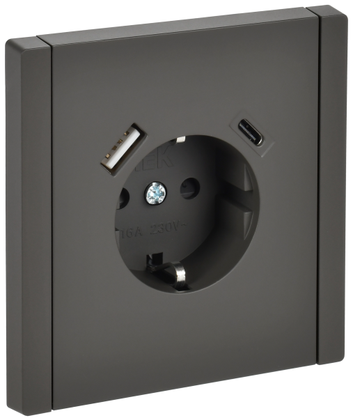 - IEK FORTE&PIANO Розетка 1-местная с заземлением с защитными шторками винтовое крепление 16А USB A+C 18Вт FP347 серый (FP-R14-16-U22-018-K03)