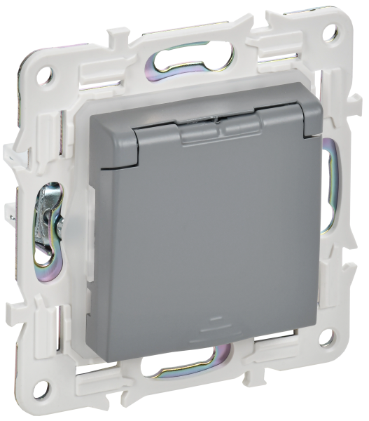 - IEK SKANDY Розетка 1-местная с заземлением с защитными шторками и крышкой 16А IP44 SK-R11Gr серый (SK-R16-16-44-K03)