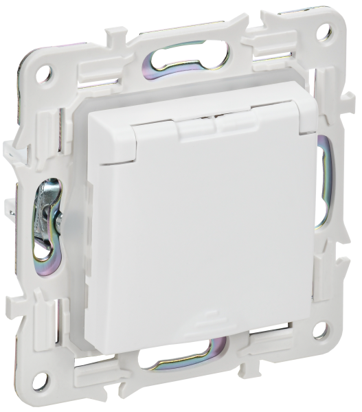 - IEK SKANDY Розетка 1-местная с заземлением с защитными шторками и крышкой 16А IP44 SK-R11W арктический белый (SK-R16-16-44-K01)