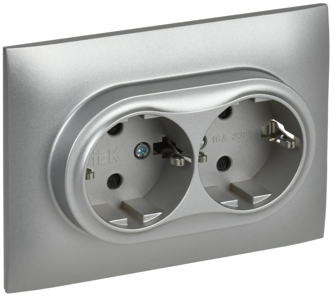- IEK SKANDY Розетка 2-местная с заземлением с защитными шторками 16А в сборе SK-R07S серебряный (SK-R24-16-K23-F)