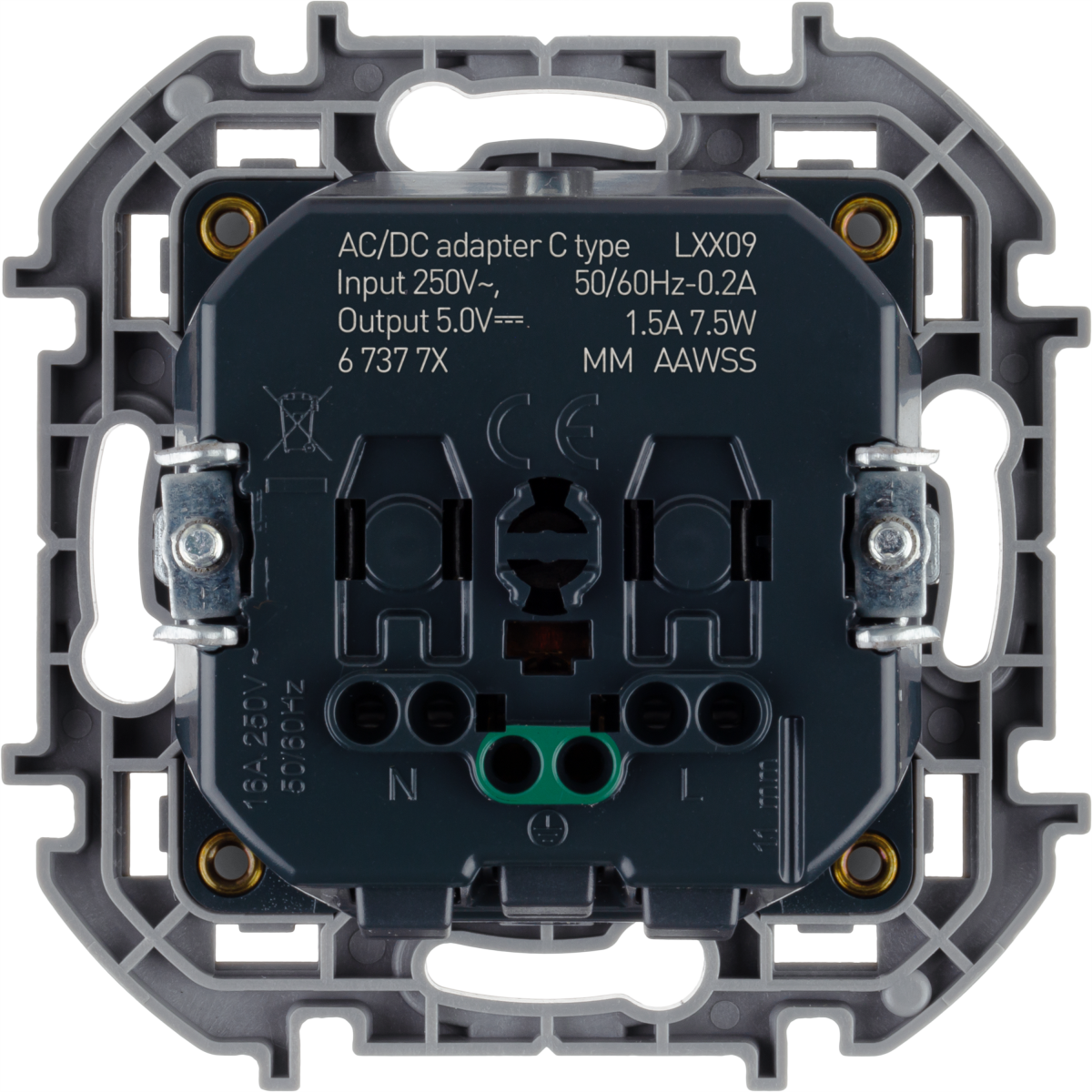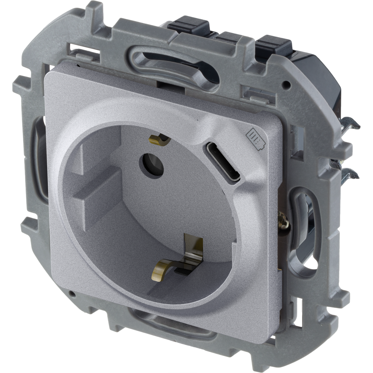 - LEGRAND INSPIRIA Комбинированная розетка 2К+З с зарядным устройством USB тип С для скрытого монтажа, цвет "Алюминий". Максимальный ток розетки 16АХ, напряжение розетки ~250В, напряжение зарядного устройства =5В, максимальный зарядный ток 1500