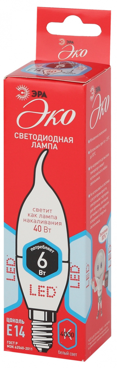- ЭРА Лампа светодиодная ECO LED BXS-6W-840-E14 (диод, свеча на ветру, 6Вт, нейтр, E14 (10/100/2800) (Б0040882)