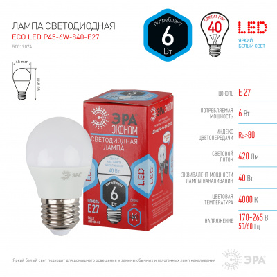 - ЭРА Лампа светодиодная ECO LED P45-6W-840-E27 (диод, шар, 6Вт, нейтр, E27) (10/100/4200) (Б0019074)