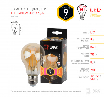 - ЭРА Лампа светодиодная филаментная F-LED A60-9W-827-E27 gold (филамент, груша золот., 9Вт, тепл, Е27) Э (Б0035038)