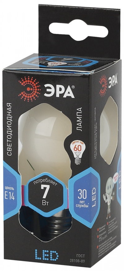 - ЭРА Лампа светодиодная филаментная F-LED P45-7W-840-E14 frost (филамент, шар мат., 7Вт, нейтр, E14 (10/ (Б0027957)