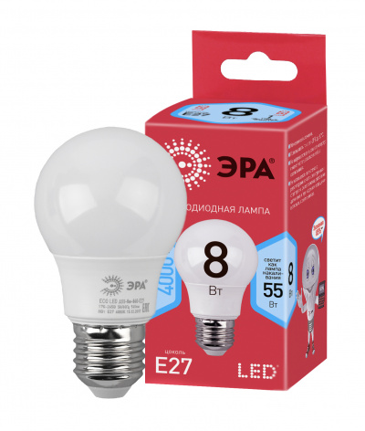 - ЭРА Лампа светодиодная LED A55-8W-840-E27,груша,8Вт,нейтр,E27 (Б0032096)