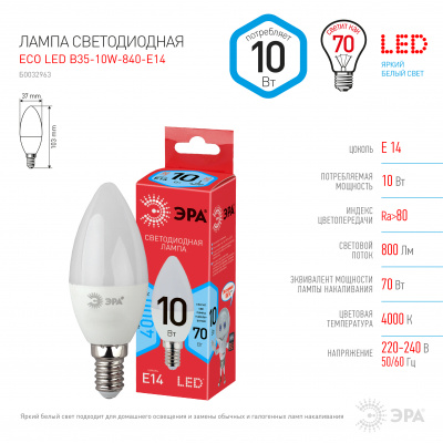 - ЭРА Лампа светодиодная LED B35-10W-840-E14,свеча,10Вт,нейтр,E14 (Б0032963)