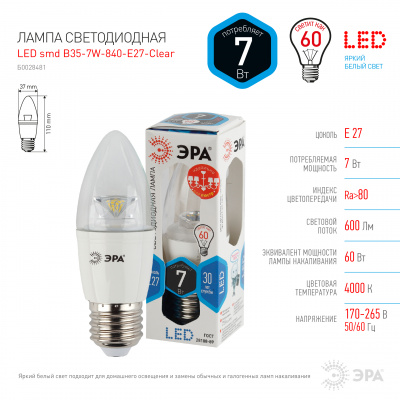 - ЭРА Лампа светодиодная LED B35-7W-840-E27-Clear (диод,свеча,7Вт,нейтр ,E27) (10/100/3500) (Б0028481)