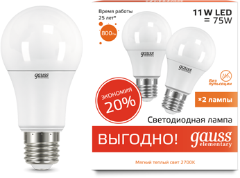 - GAUSS Лампа светодиодная LED 11Вт 230в, E27, теплый A60 ПРОМО (2шт в упак) (23211P)