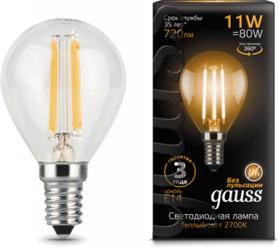 - GAUSS Лампа светодиодная LED-11Вт E14 720lm 2700K Filament Шар (105801111)