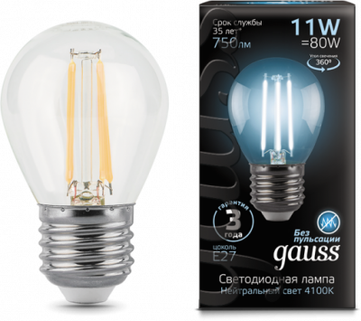 - GAUSS Лампа светодиодная LED 11Вт E27 750lm 4100K Filament Шар (105802211)
