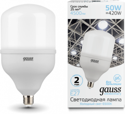 - GAUSS Лампа светодиодная LED 50Вт T140 E27 4500lm 180-240V 6500K Elementary (63235)