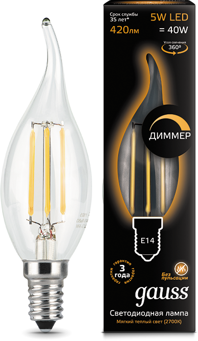 - GAUSS Лампа светодиодная LED 5вт 230в Е14 2700K прозрачная свеча на ветру FILAMENT (104801105)