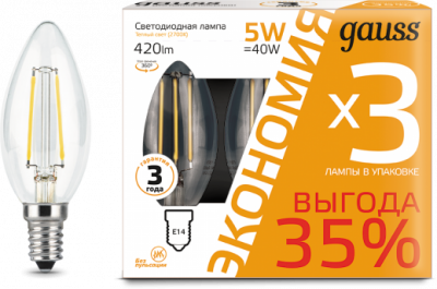 - GAUSS Лампа светодиодная LED 5Вт E14 2700К Filament Свеча (3 лампы в уп) (103801105T)