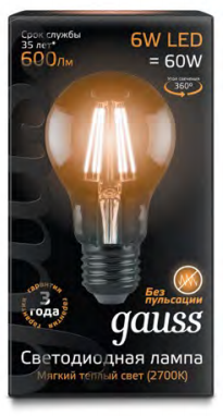 - GAUSS Лампа светодиодная LED 6вт 230в Е27 FILAMENT теплый (102802106)