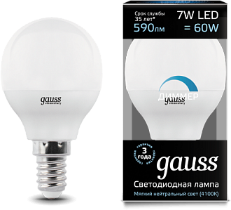 - GAUSS Лампа светодиодная LED 7вт, 230в, Е14, белый, dim, шар (105101207-D)