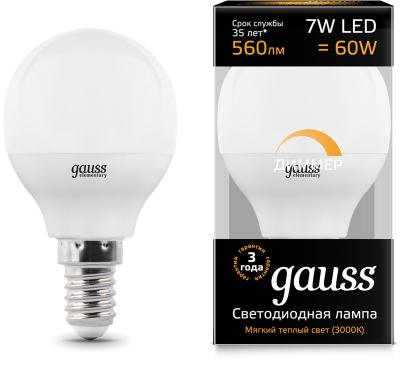 - GAUSS Лампа светодиодная LED 7вт, 230в, Е14, теплый, dim, шар (105101107-D)