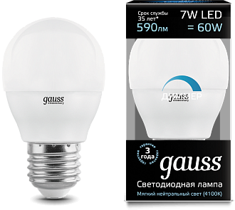 - GAUSS Лампа светодиодная LED 7вт, 230в, Е27, белый, dim, шар (105102207-D)