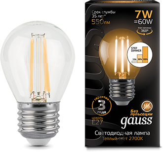 - GAUSS Лампа светодиодная LED 7Вт E27 2700K Filament Globe step dimmable (105802107-S)