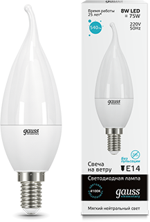 - GAUSS Лампа светодиодная LED 8вт 230в,Е14,белый, свеча на ветру Elementary (34128)