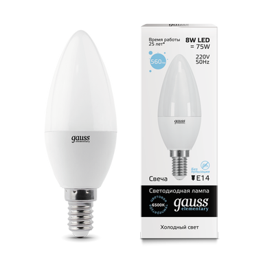 - GAUSS Лампа светодиодная LED 8вт 230в, Е14, дневной, свеча Elementary (33138)
