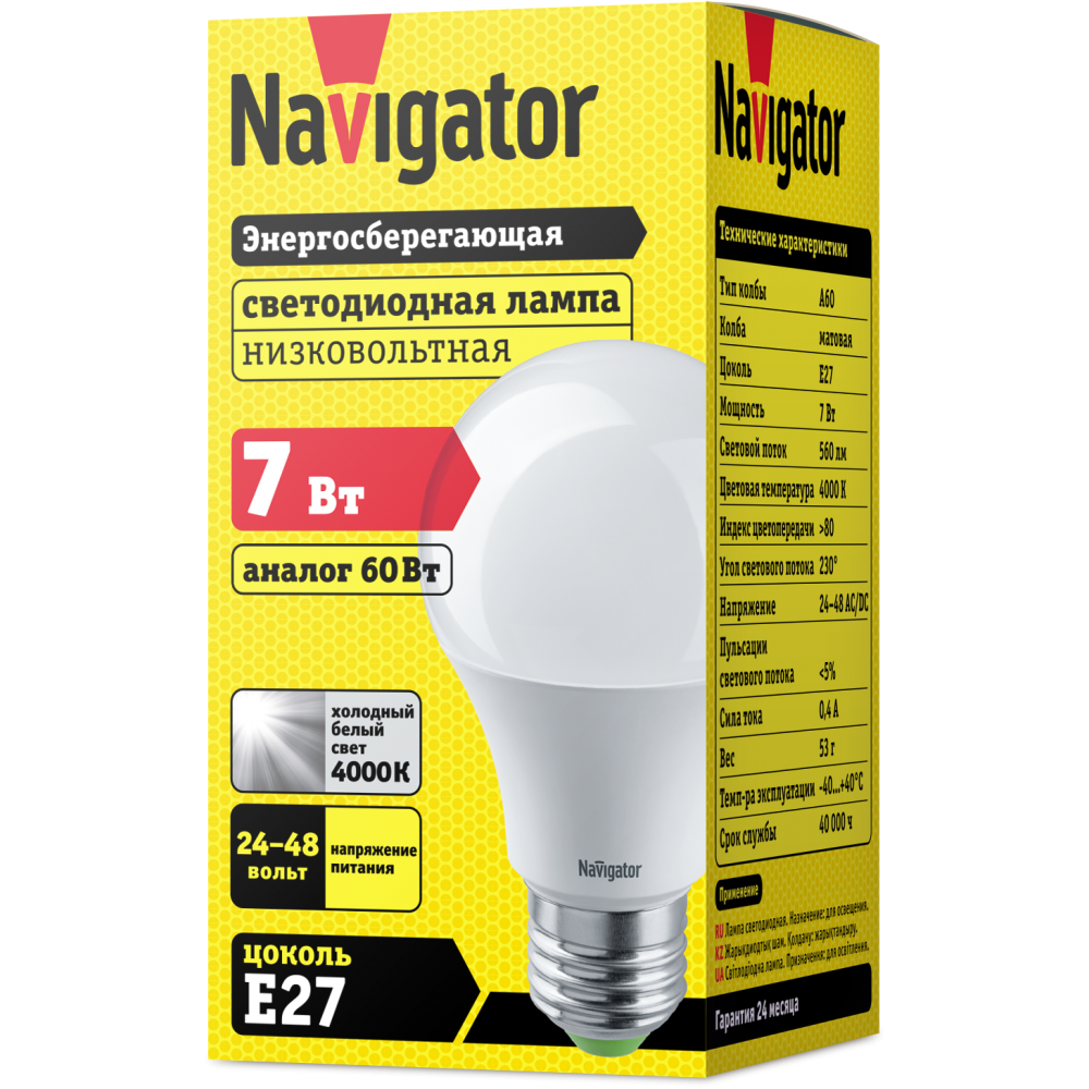 - NAVIGATOR Лампа светодиодная LED 7вт 24/48в Е27 белый (61474 NLL-A60) (20640)