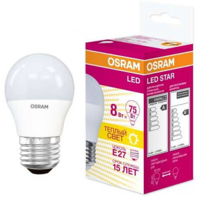 - OSRAM Лампа светодиодная LED 8Вт E27 CLP75 тепло-бел, матов.шар OSRAM (4058075210868)