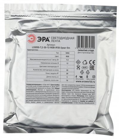 - ЭРА Светодиодная лента LS5050-7,2-30-12-RGB-IP20-2year-5m 12В (Б0044120)