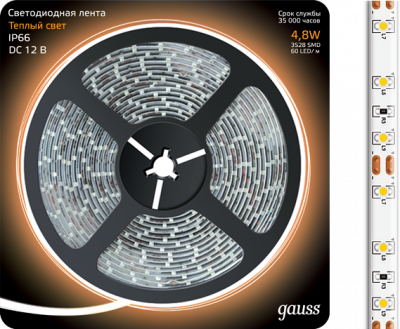- GAUSS Лента светодиодная LED 2835/60-SMD 4.8W 12V DC теплый белый IP66 5м (311000105)