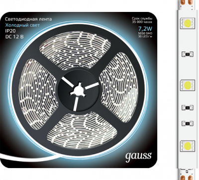 - GAUSS Лента светодиодная LED 5050/30-SMD 7.2W 12V DC холодный белый 5м (312000307)
